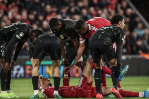 体育资讯4月15日讯 欧冠1/4决赛次回合利物浦主场迎战巴黎,埃基蒂克上半场无对抗倒地,疑似遭遇跟腱重伤。